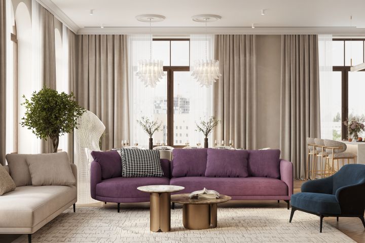 Из шикарных вводных, которые мы получили — 2 этажа, террасу с прекрасным видом на старую Москву, округлые высокие окна) Получился подход больше архитектурный- упор на объемы и формы, фактуры крупными пятнами. А фиолетовый диван как акцент.