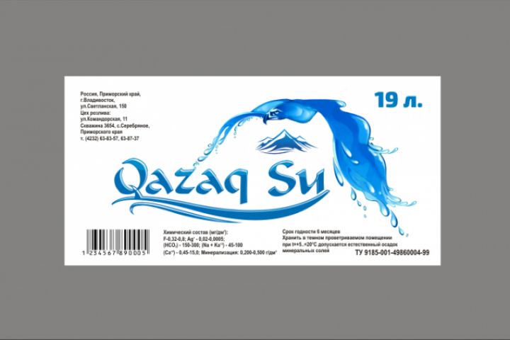 Наклейка на 5 и 19-литровую бутыль воды "Qazaq Su". Использую птицу-сапсана с герба Казахстана, вместо крыльев использую образ водных брызг.