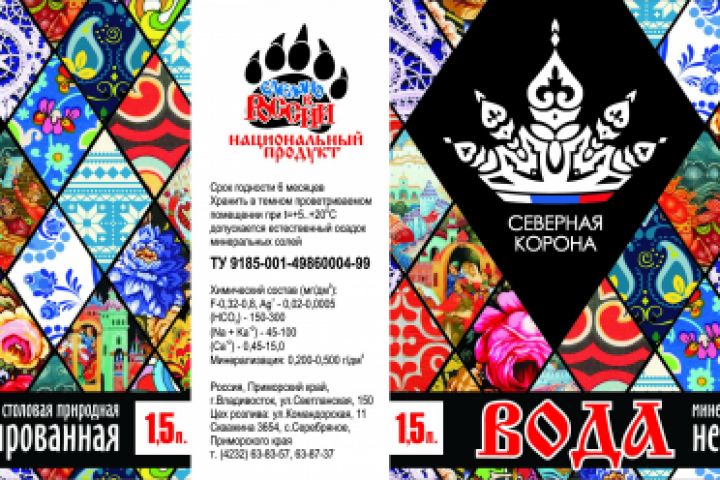 Наклейка на бутылку воды "Северная корона" в стиле "Национальный продукт". Основная задача - логотип должен быть на двух сторонах, использовать национальные текстуры народов, проживающих на территории России.