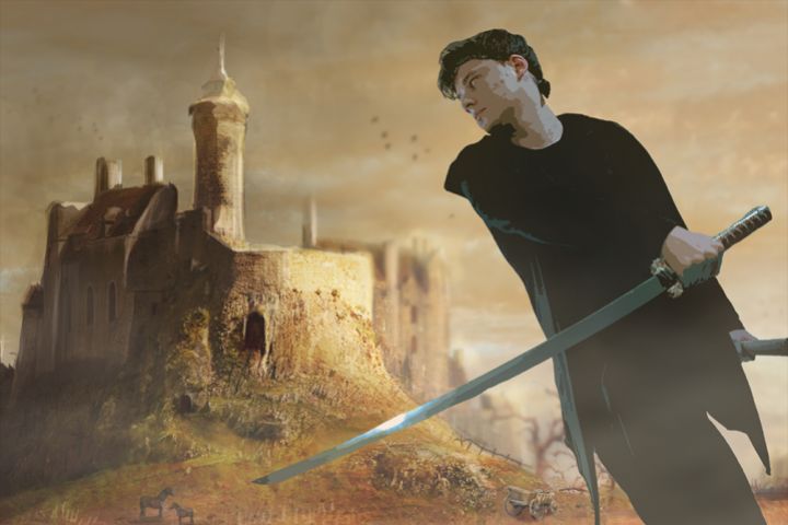 Тут я только вставил персонажа, подкорректировал так, чтобы вписывался к фону, добавил тележку на фоне и размыл нужные для этого объекты, и переделал фото в рисунок