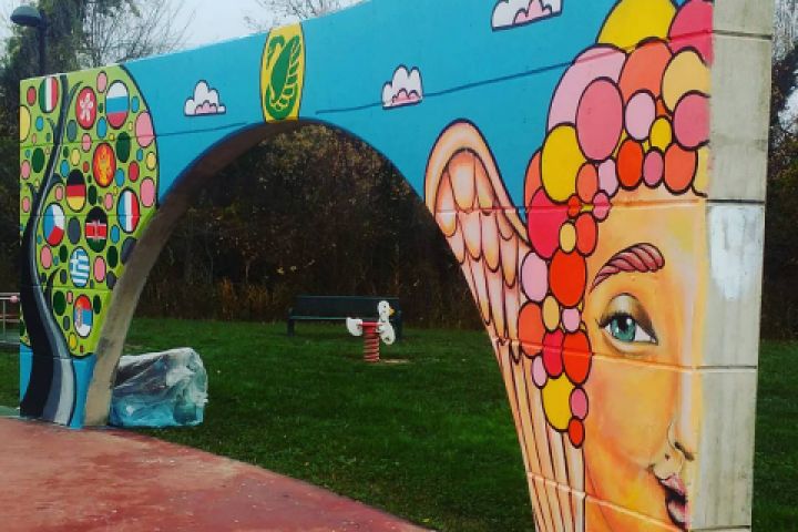 Моя первая стрит-арт работа. Проект был нарисован на детской площадке в городе Доло(Италия) в поддержку волонтерского проекта, направленного на восстановление природной зоны после торнадо 2015г. С левой стороны я нарисовала дерево с флагами тех стран, из которых состояла команда волонтеров, а справа ангела, который теперь охраняет эту территорию.