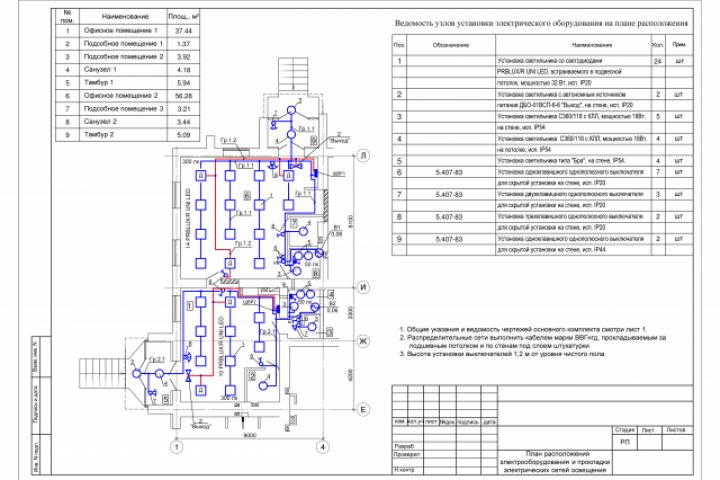 Марка ЭОМ. План расположения электрооборудования и прокладки электрических сетей Освещения офисного здания.