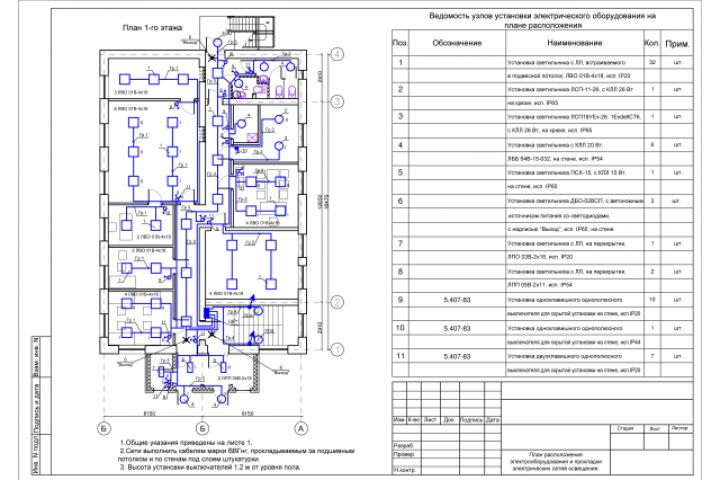 Марка ЭОМ. План расположения электрического оборудования и прокладки электрических сетей Освещения на 1-ом этаже административного здания.