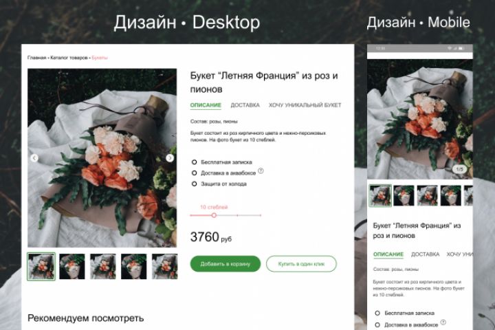 Сделать карточку товара, на которой не нужно будет делать большое количество кликов для получения всей необходимой информации о товаре. Информация о доставке и о возможности получения уникального букета должна быть на виду у клиента.