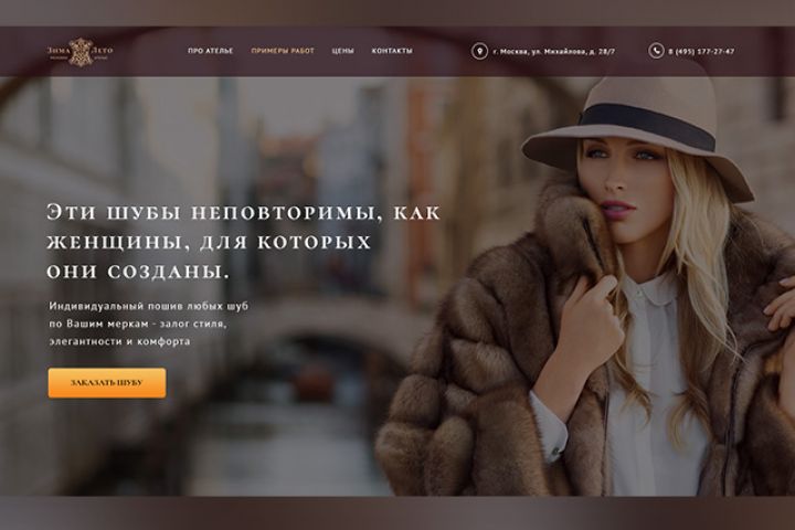Landing Page для услуги пошива шуб по индивидуальным меркам. Стильный дизайн страницы создает ощущение элегантности и роскоши, которое подчеркивает эксклюзивность предлагаемой услуги.