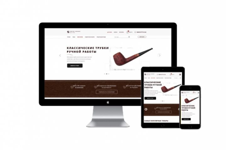Адаптивный дизайн интеренет-магазина по продаже курительных трубок и аксессуаров. Выполнен в легком утонченном стиле, который подчеркивает атмосферность и премиальность предлагаемых товаров.