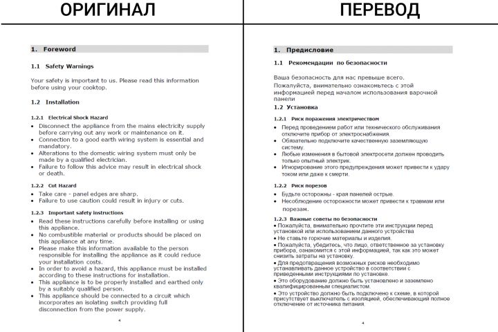 Полный перевод инструкции для встраиваемой в столешницу индукционной панели с англ. на русский язык с сохранением расположения элементов (верстки).