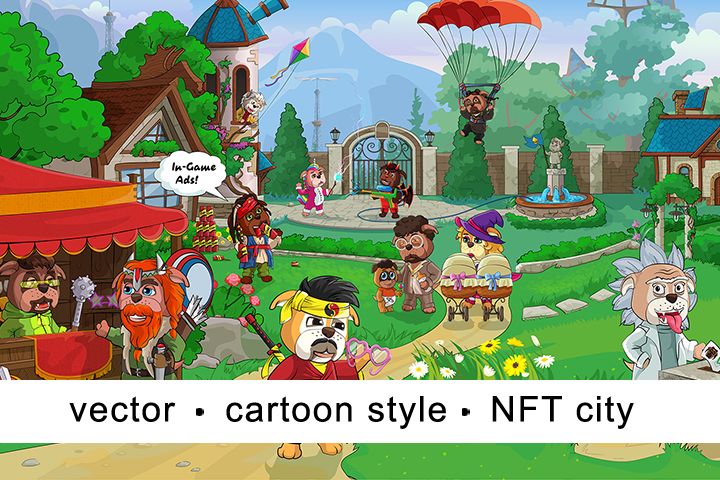 Город с ранее созданными персонажами серии NFT для главной страницы сайта.