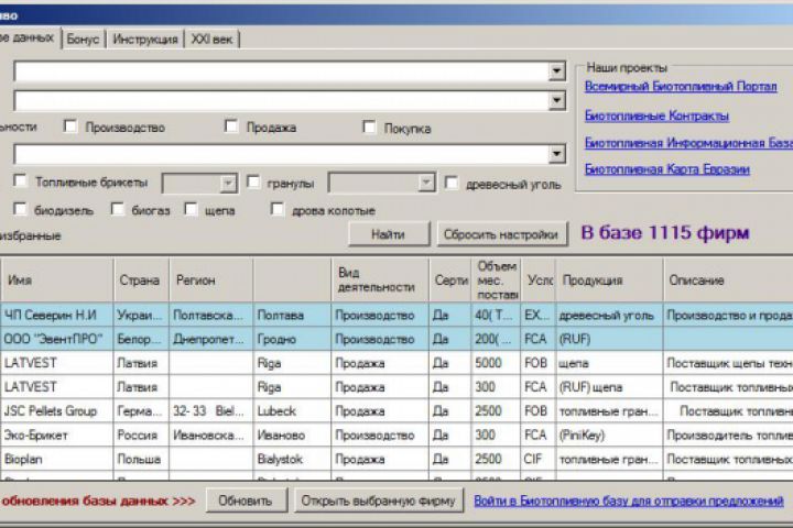 Для пополнения БД проводится авторизированный вход на Биотопливный Потал и парсинг каталога предприятий.