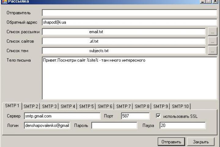 Работа ведется через несколько почтовых серверов – до 10 настроек. Для исключения блокировки СПАМ-контроля, задаются паузы для каждого сервера и используется транслитерация по разным символам схожего начертания латиницы и кириллицы