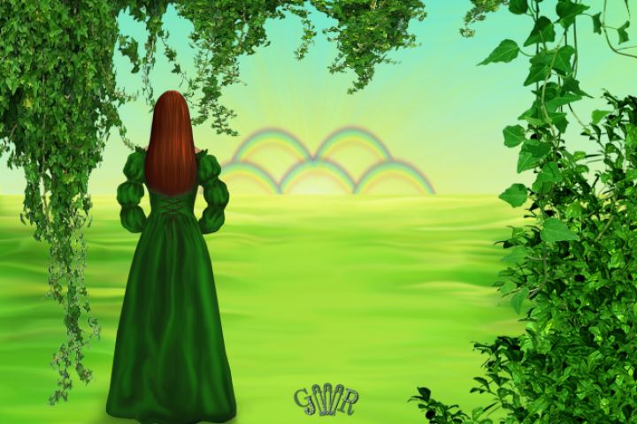Она долго бродила босиком по густым джунглям, густо увитым лианами и вдруг перед глазами внезапно возникла зеленая долина, залитая утренними лучами июньского солнца...и не горизонте вспыхнуло 5 радуг, похожие на олимпийские полукольца.