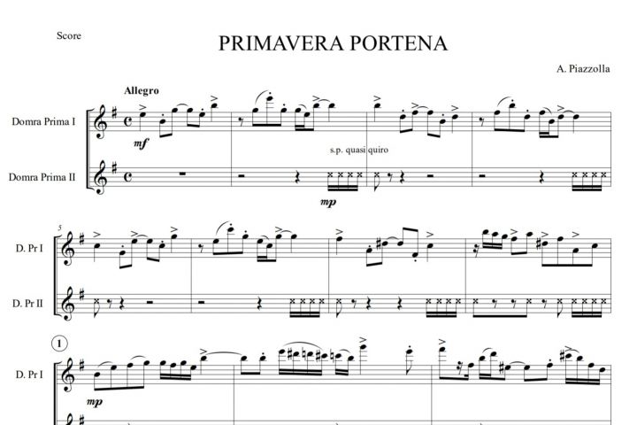 Переложение скрипичного произведения Астора Пьяццоллы «Primavera Portena» на состав инструментов: Первая и вторая домры малые; домра альт; домра бас. Сделано по заказу исполнителей на концерт.