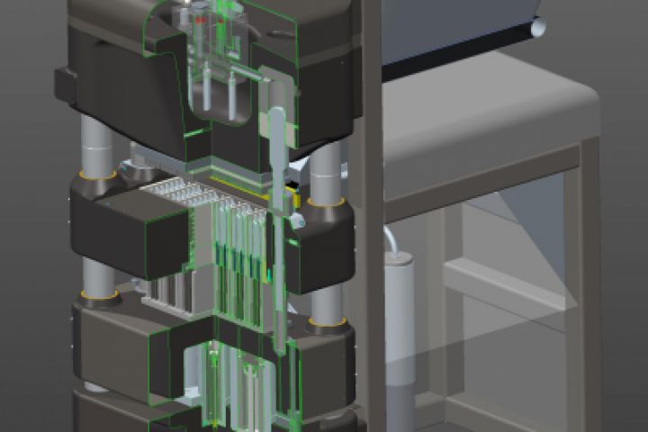 Гидравлический пресс-автомат усилием 600 тонн для производства строительных материалов. Гидравлические компоненты также разработаны с нуля и рассчитаны на давление 700 атм. Пресс в автоматическом режиме дозирует сырье из бункер, прессует и выталкивает сформованные изделия на приемный столик откуда уже робот забирает их для укладки на вагонетку.