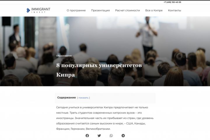 Задача – написать обзорно-аналитическую статью о популярных государственных и частных университетах Кипра для проекта Immigrant Invest. В статье рассматриваются основные направления обучения, даются рекомендации, как поступить в каждый из вузов и какие документы подготовить.