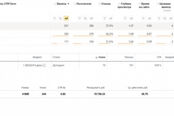 На скриншотах показана статистика за 1,5 месяца из рекламных кабинетов Яндекс и Google. Кроме того, на отдельном скриншоте приведена статистика по конверсиям из Яндекс.Метрики.