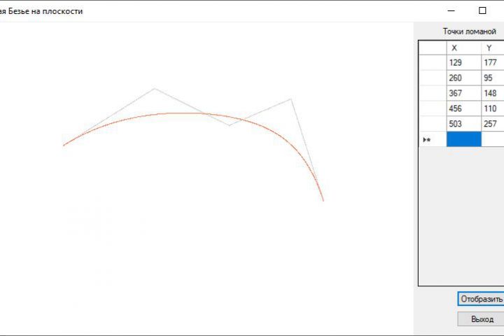 Приложение рассчитывает и отображает на плоскости кривую Безье на основе задающей ломаной, определяемой тремя или большим количеством точек. Приложение обеспечивает редактирование координат точек задающей ломаной с перерисовкой сплайна Безье.