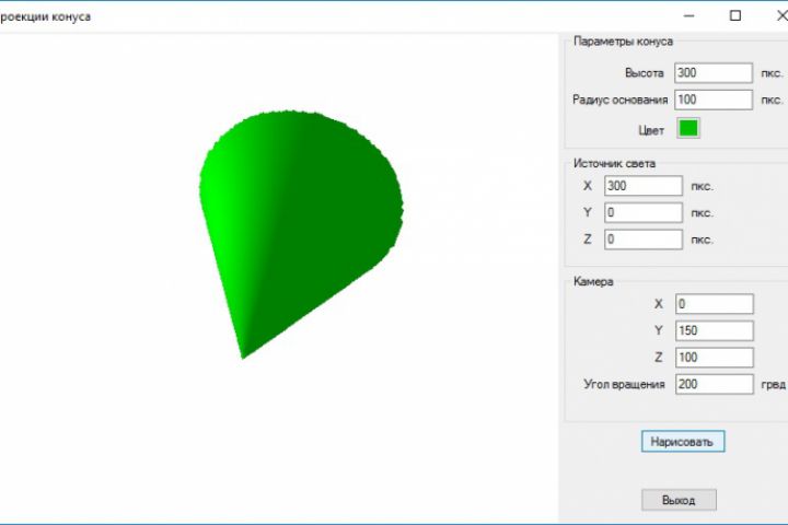 Разработано с нуля приложение для отображения конуса с разных ракурсов. В приложении можно задавать