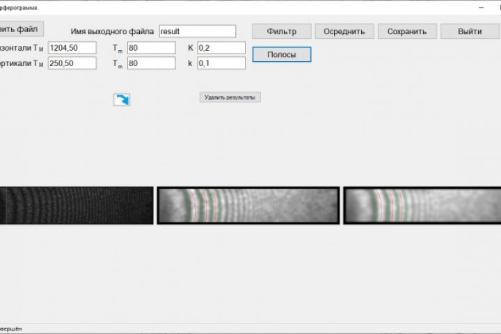 Обработка фото с помощью спекл-фильтра и разграничения границ полос а также вывод графика интенсивности полос. Предварительно можно провести поворот и фильтрацию начального изображения.