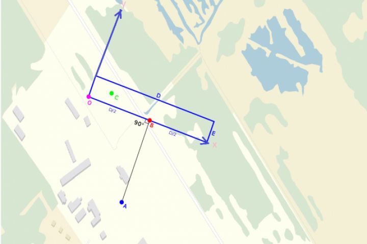 В географической системе координат WGS-84 заданы координаты точек A, B и С. Расстояние между ними мало по сравнению с радиусом Земли. Перпендикулярно линии AB проведён через точку B отрезок длиной D так, что точка B делит его пополам. Данный отрезок является стороной прямоугольника. Другой образующей стороной прямоугольника является отрезок в направлении линии AB длиной E.