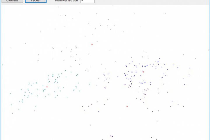 Равномерное распределение массива точек по зонам. Точки распределяются по зонам с помощью алгоритма k-means с условием, что количество точек в каждой зоне не отличается более чем на 1 по сравнению с количеством точек в любой другой зоне.