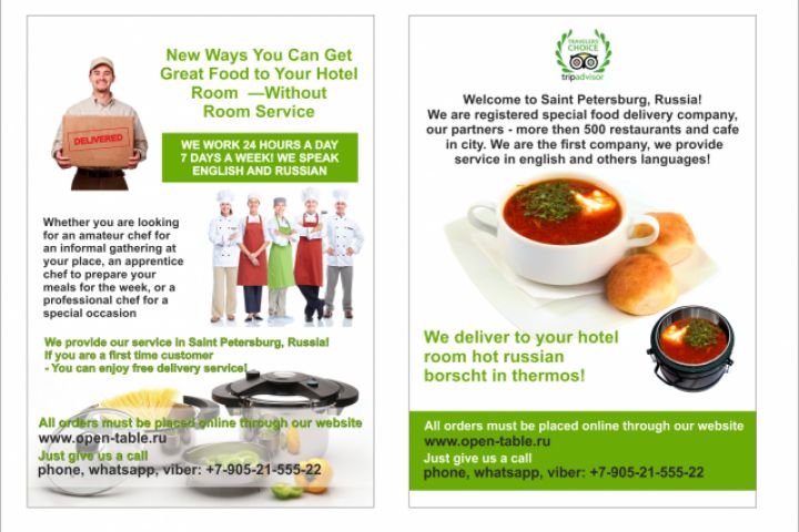 Листовка А5 двух сторонняя. Доставка еды заказ поваром в номер и на дом.