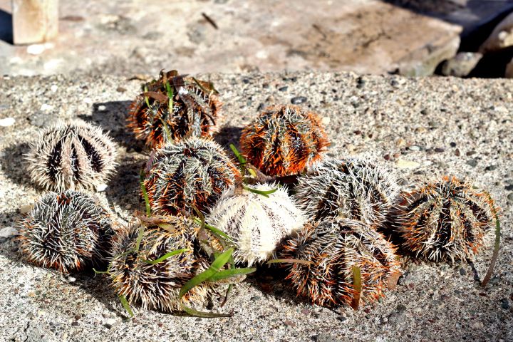 Изображение нескольких разноцветных морских ежей на берегу моря