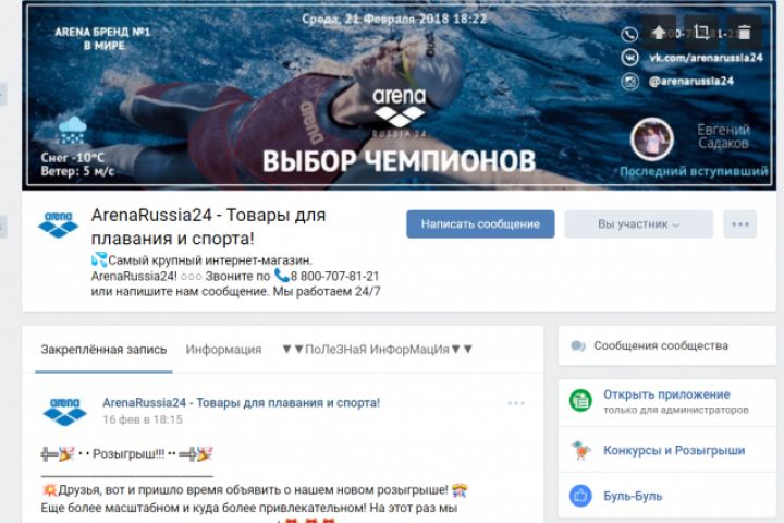 Для сайта https://arenarussia24.ru/ созданные группы в Вконтакте и instagram Полное оформление, оптимизация и сопровождение групп. Белое продвижение группы в Вконтакте - за месяц + 2500 целевой аудитории.