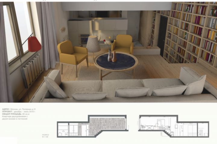 Изменена принципиальная схема зонирования. На первом этаже небольшая кухня и отдельная спальня. В ненесущей стене между этими зонами добавлено окно, обеспечивающее прониктовение дневного света. На втором уровне гостиная с местами для отдыха и работы.