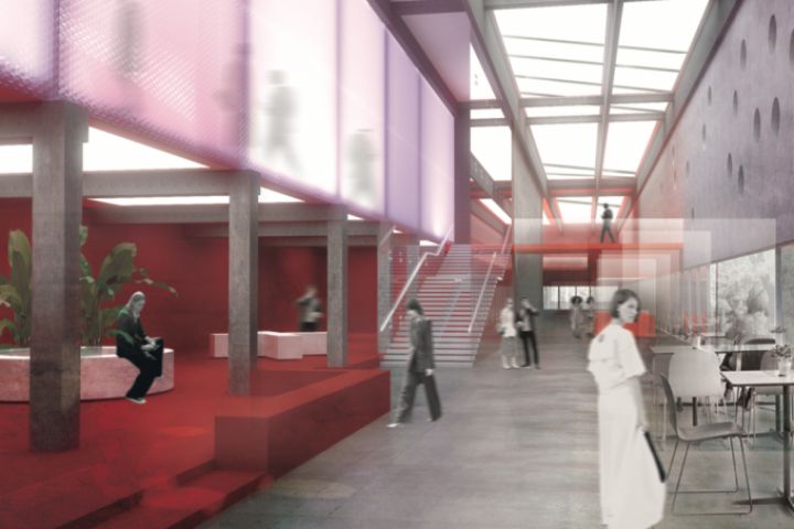 Интерьер фойе кинотеатра состоит из нескольких функциональных зон, каждая из которых обозначена своим цветовым решением. Зона кафе — пространство красного цвета. Зона магазинов — оранжевая. Сиреневый блок этажом выше — выставочная зона и административная часть.
