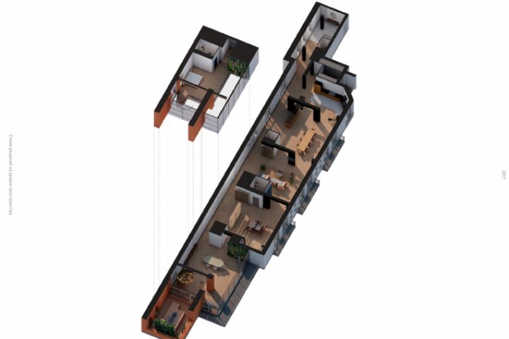 выходят на север. Во второй части есть возможность воссоздать искусственный свет, там находится оборудование и офортный станок. Cпальня поднята над мастерской на антресольный этаж, откуда есть выход на крышу — отнеся ее на другой уровень, подчеркивается ее особый статус, как личного пространства заказчика.