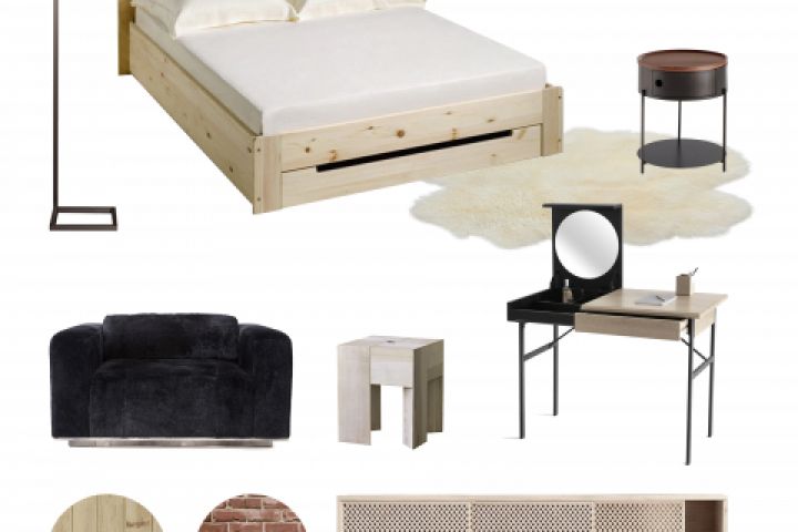 Концептуальный коллаж спальной с подбором мебели и материалов