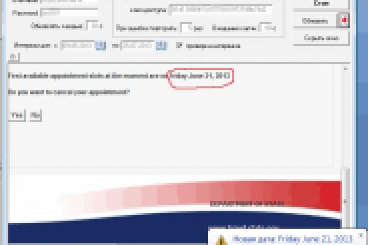 Выводится сообщение в трее + звук при смене даты на странице https://cgifederal.secure.force.com/applicanthome. Обновление страницы по таймеру. Капча - antigate.com. Ограничение диапазона дат при выводе сообщения. Браузер встроен в окно программы.