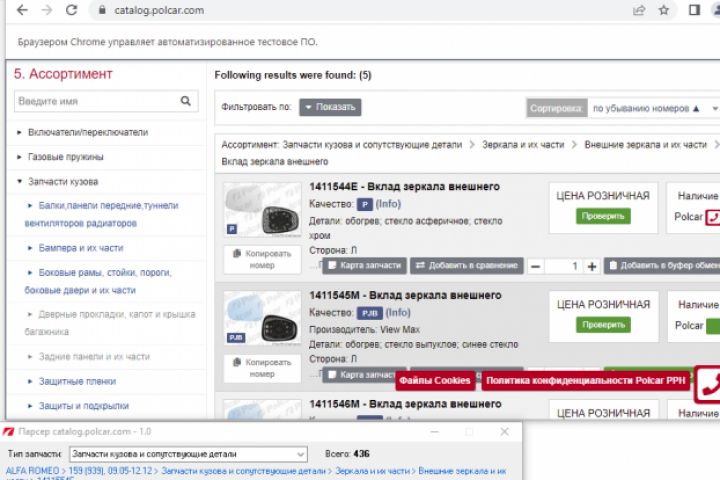 Парсит из catalog.polcar.com в Excel файл всю базу запчастей, а картинки в папку с разделением по маркам и моделям. Сайт для парсинга сложный, сделана имитация действий пользователя.