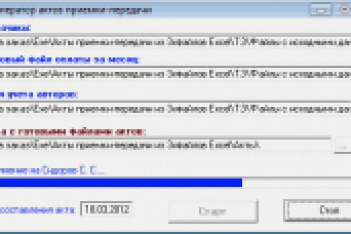 Есть три файла Excel с исходными данными, программа, берет данные из этих файлов и формирует нужные документы: акты приемки-передачи и итоговый файл с оплатой за период.