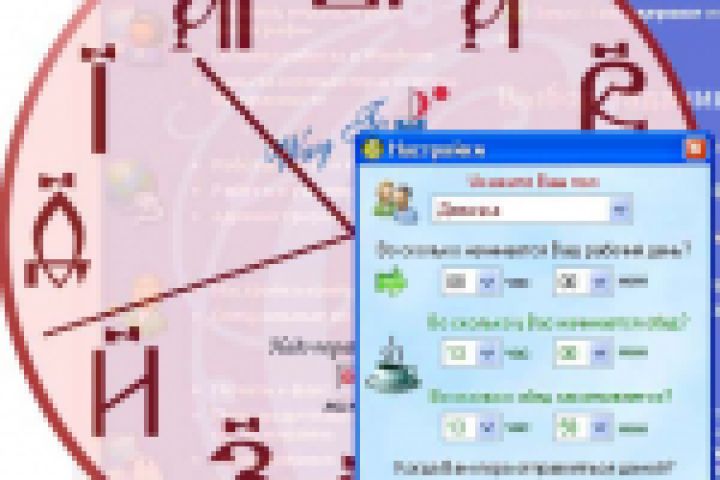 В трэе появляется значок часов, и каждый час выводится напоминание о перерыве в виде циферблата, а также сообщение. То же для обеда.
