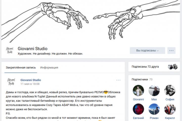 Поддержите меня подпиской/репостом/лайком. В группе выкладываются мои работы, коллаборации и мероприятия, которые я организовываю со своей командой.