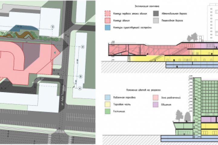Схема планировочной организации и разрезы концептуального проекта торгово-развлекательного комплекса