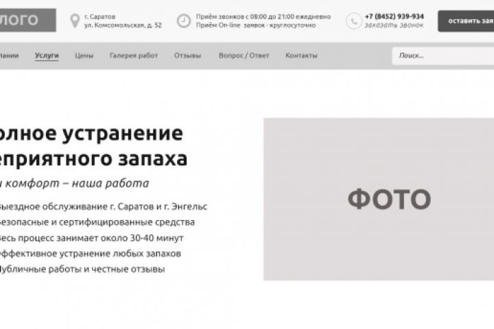 Фирма ZapahaNet. Тут представлена страница услуг "Устранение запаха" . Выполнена в виде лендинга.