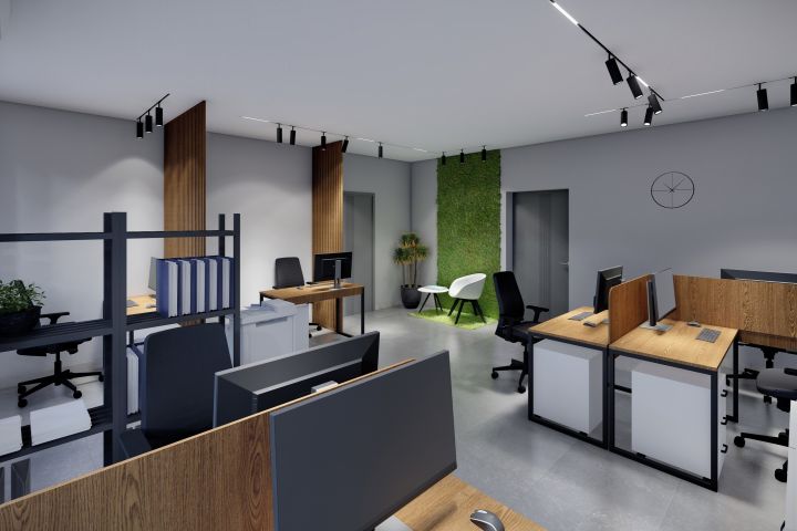 Главной задачей было разместить в небольшом кабинете 7 человек, сделать не дорогое, интересное и функциональное пространство для работников.