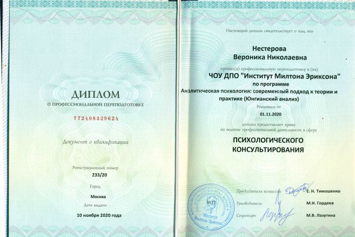 Имею дипломы по психологии: «Аналитическая психология» (Юнгианский анализ) Московский институт Милтона Эриксона (МИМЭ),
