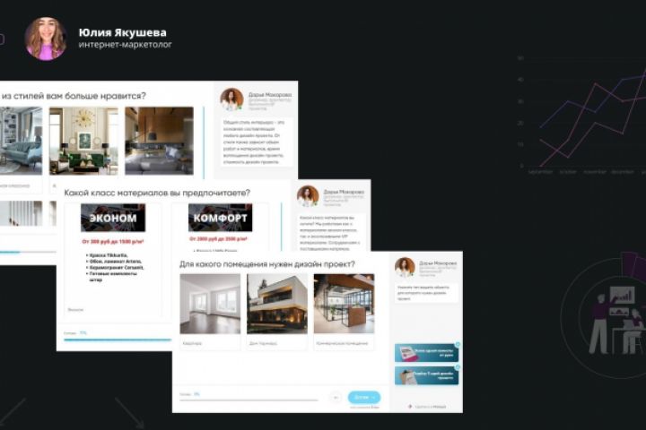 На первой странице мы предлагаем посетителю пройти простой тест из 7 вопросов за 1 минуту и получить эскиз одной комнаты от руки и 5 идей дизайна интерьера - что заинтересовывает клиента дойти до конца и оставить свои контакты, чтобы узнать результат и забрать бонусы.