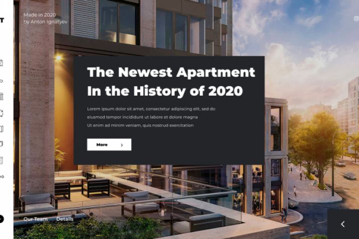 Первый экран сайта на тему Апартаментов. Как по мне получилось довольно классно, наблюдается единая идея, которая поддерживается на всем сайте.