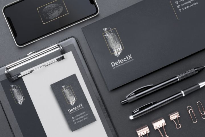 Логотип в вид отпечатка пальца. Фирменный стиль с графитовых цветах. При этом нет явных стереотипных общепринятый ассоциаций с детективами из кино. Что придает серьезности и узнаваемости, а это и требовалось в задаче.