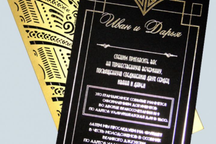 Открытка приглашением в стиле Гетсби (арт-нуво): карточка матовой дизайнерской бумаги с горячим тиснением текста и рисунка золотой фольгой и конверт с резным рисунком из золлтой бумаги маджестик.