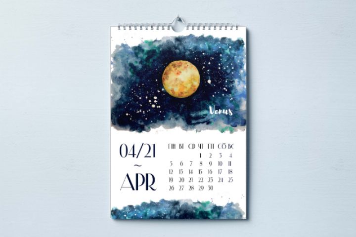 Иллюстрация акварелью планеты на фоне тёмного неба с россыпью звёзд была выполнена для разработки концепции настенного календаря на год.