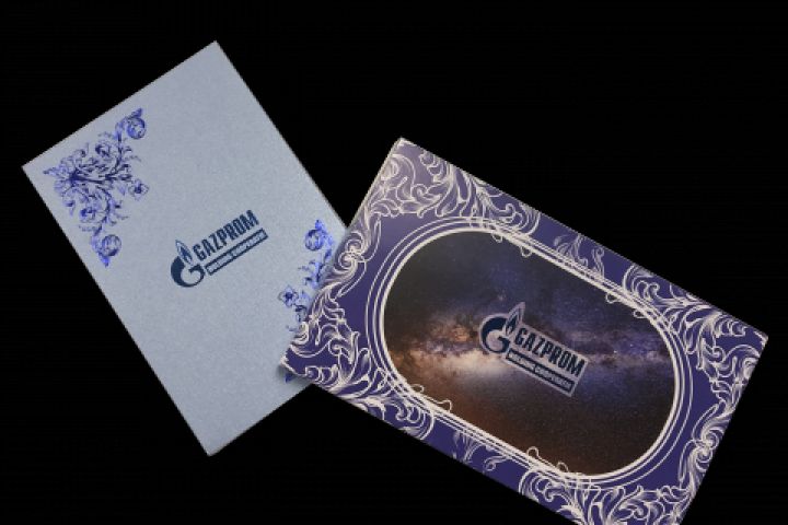 Шубер на коробку с новогодним подарком на тему Космос. Технологии: печать и тиснение логотипа, биговка, склейка.