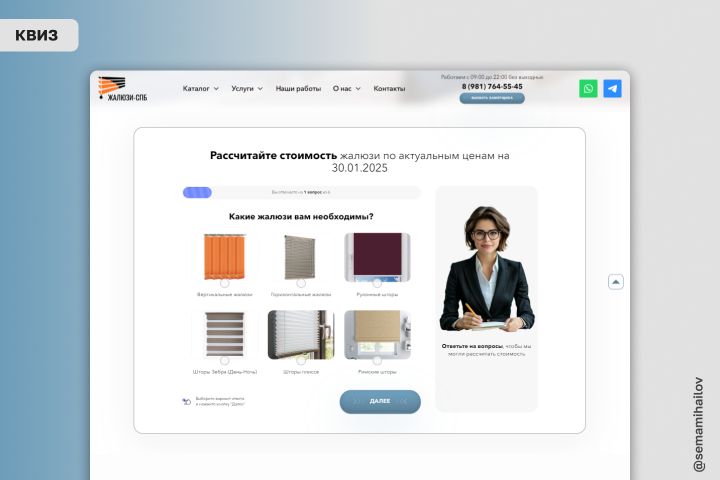 Квиз для компании "ЖАЛЮЗИ-СПБ" на главной странице, в конце опроса данные отправляются на почту администратору сайта + Посадка Квиза на WordPress