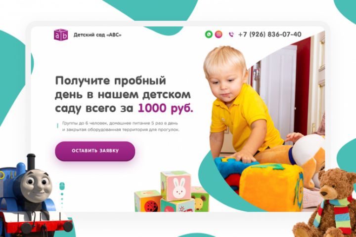 Задачей было сделать короткий тестовый лендинг для частного детского сада в Москве, используя фирменные цвета и реальные фотографии детей, сделанные в их садике. Также нужно было отрисовать расписание и меню.