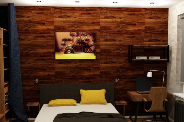 Ничего лишнего, лофт, минимализм, много дерева - вот описание спальни от заказчика. Комната маленькая, но необходимо разместить двуспальную кровать, рабочее место и шкаф для одежды. Дверцы шкафа при открывании заняли бы много места, двери шкафа-купе также бы "украли" драгоценные сантиметры, поэтому сделали нишу для гардероба с плотной, джинсовой занавеской. Такой вариант сохранил место для подхода к гардеробу и отвечает стилистике интерьера.