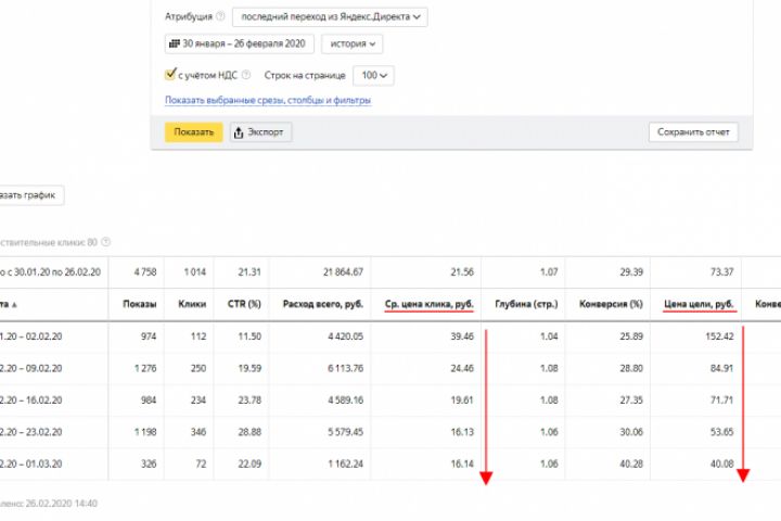 За месяц работы удалось снизить цену клика в 2,5 раза (с 40 до 16 рублей) и цену цели в 3 раза (с 150 до 50 рублей)